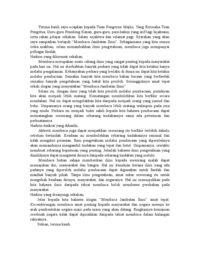 Secara tuntasnya amalan membaca ini haruslah dijadikan budaya dalam kehidupan agar amalan ini terus diamalkan dari zaman ke zaman tanpa perlu lagi diadakan kempen kesedaran kepada masyarakat. Tulis teks syarahan itu selengkapnya. Assalamualaikum dan selamat pagi.